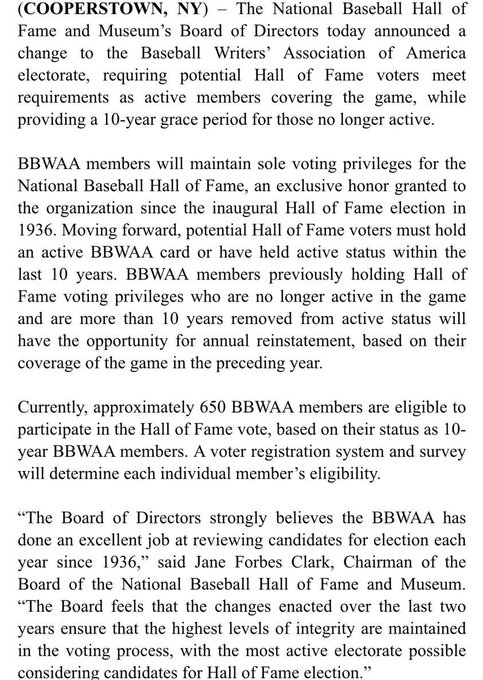 The National Baseball Hall of Fame announced a major change Tuesday to the process by which players are voted into Cooperstown. The Hall of Fame is making the Baseball Writers Association of America, the longtime arbiters of voting, to take away ballots from members who haven't actively covered baseball in 10 years.