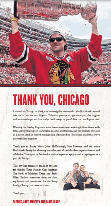 It’s almost a cliche at this point: when someone spends a long time in a city, that player (or even coach) will take a full-page newspaper advertisement out to say goodbye and thank you. Considering his lengthy stay with the Chicago Blackhawks, it’s no surprise that Patrick Sharp did just that, placing an ad with newspapers including the Chicago Tribune: