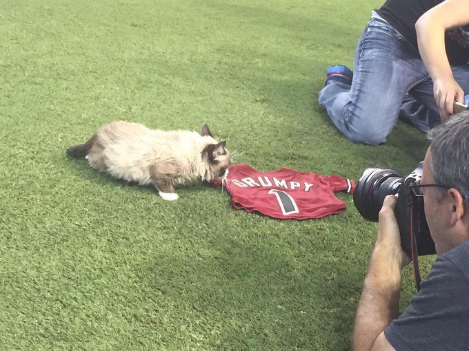 The classic picture was made possible by the Diamondbacks, who actually held a Grumpy Cat promotion on Monday. That included the Grumpster herself throwing out the first pitch.