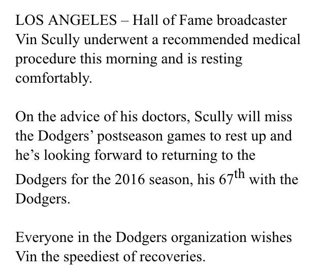 Los Angeles Dodgers Hall of Fame broadcaster Vin Scully's iconic voice won't be heard for the rest of the season after Scully underwent an unspecified medical procedure and decided not to participate in the postseason on the advice of his doctors. The Dodgers reported Scully is in good condition and is resting comfortably.