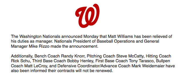 The Nats made this one quick, making Williams the first MLB manager to lose his job on this Monday after the regular-season concluded. (The Padres canned interim manager Pat Murphy on Sunday). The Williams news was first reported by James Wagner of the Washington Post and later confirmed by the Nats, who not only fired Williams but his entire staff too: