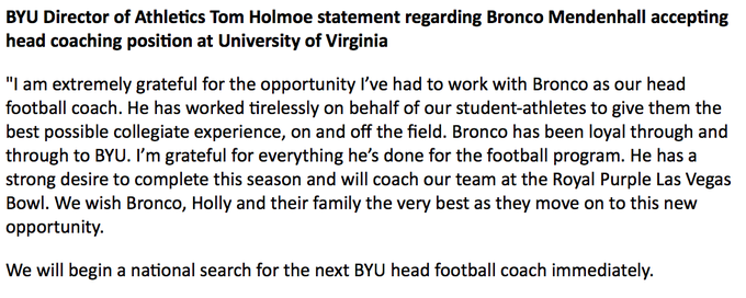 Before he takes over at Virginia, Mendenhall will stay with BYU to coach the team in the Las Vegas Bowl on Dec. 19.