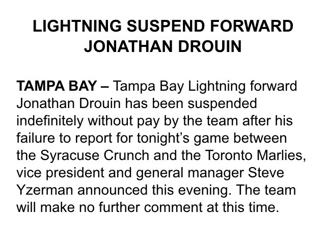 The most famous 20-year-old AHL'er at the moment did not show for the Syracuse Crunch's game against the Toronto Marlies. For that, the Crunch's parent club, the Tampa Bay Lightning, suspended the forward without pay for not appearing.