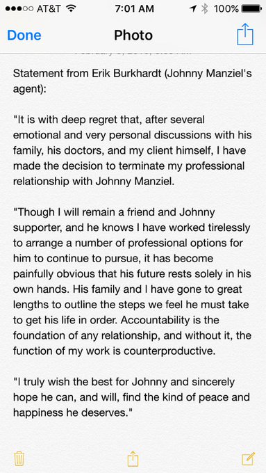 Johnny Manziel's agent has parted ways with him, as seen in this statement: pic.twitter.com/JKVEHOAeHm