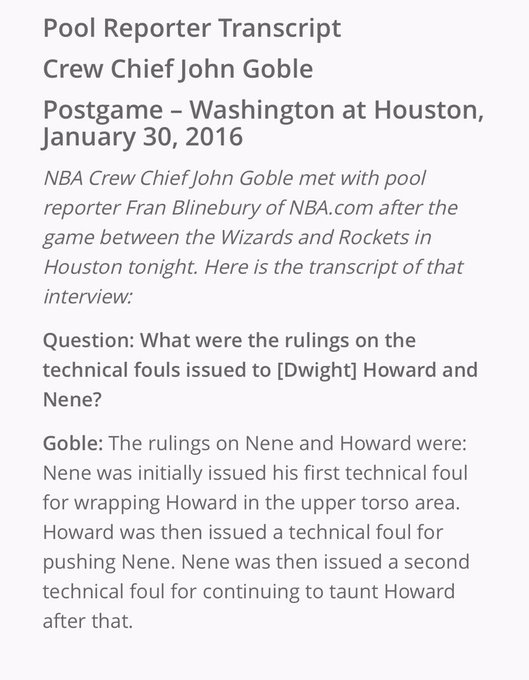 Referee chief John Goble talks about ruling on technical fouls on Houston's Dwight Howard and Washington's Nene. pic.twitter.com/KuFSS9I07B