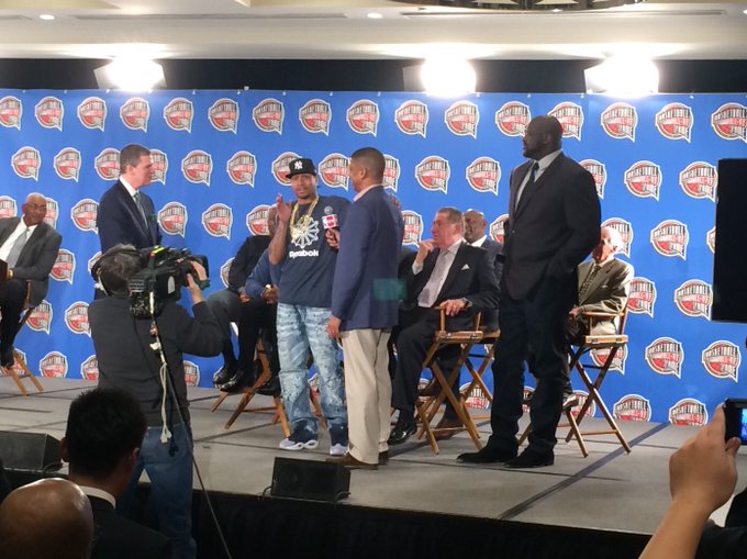 Behind the scenes. Allen Iverson, Kevin Johnson & Shaquille O'Neal on stage as 2016 Class Finalists. #NBAAllStarTO pic.twitter.com/DxsTtSsccp