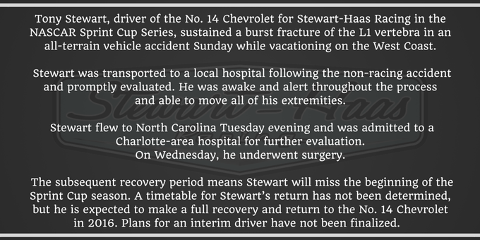 According to a Stewart-Haas Racing statement, he was flown to North Carolina on Tuesday and underwent surgery on Wednesday. "The subsequent recovery period means Stewart will miss the beginning of the Sprint Cup season," the statement read. "A timetable for Stewart's return has not been determined, but he is expected to make a full recovery and return to the No. 14 Chevrolet in 2016." The team did not announce a replacement driver.