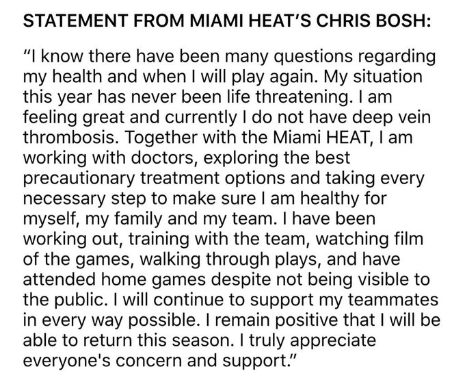 The best possible news has hit: Chris Bosh is free from any blood clots. Less important but no less warming is his assertion that he hasn’t ruled out playing basketball for the Miami Heat this season.