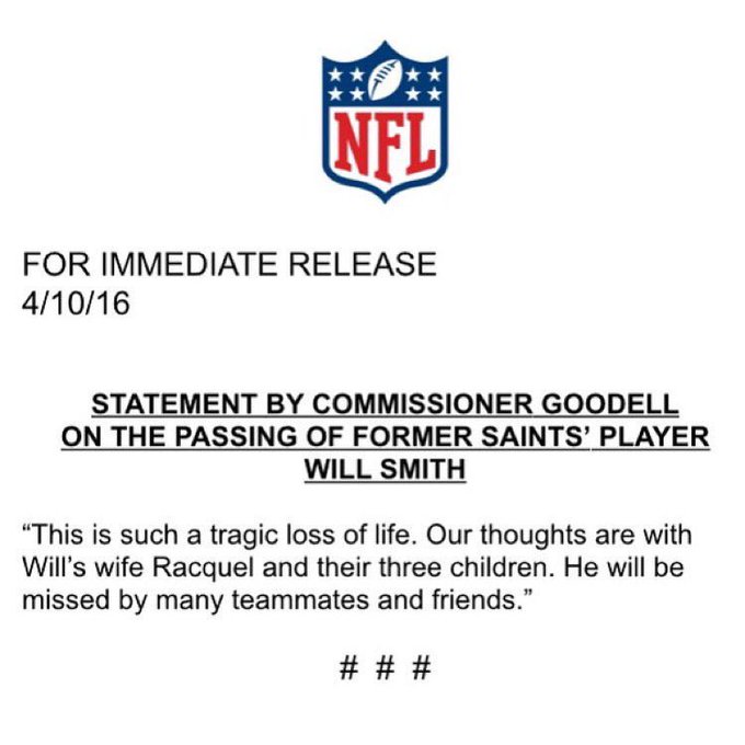 “We are devastated and saddened by Will’s tragic and preventable death due to a senseless act that will leave a lasting scar on our community forever,” Saints owner Tom Benson said in a statement. “Will was more than an exceptional football player he was a father, a husband, a son, a brother and teammate to so many and an inspiration to countless more. He will be greatly missed by all those he touched and impacted both on and off the football field and his legacy will continue to shine. The Saints family is hurting and devastated as it has lost a member too young and too soon.”