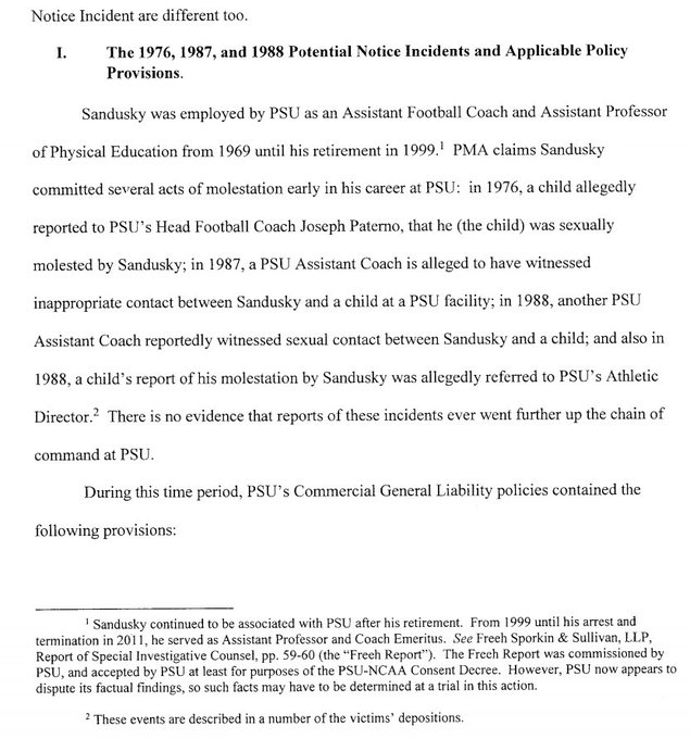"There is no evidence that reports of these incidents ever went further up the chain of command at PSU," Judge Gary Glazer wrote, in determining that because Penn State's executive officers - its president and trustees - weren't aware of the allegations, he would not bar claims from that time frame from insurance coverage.