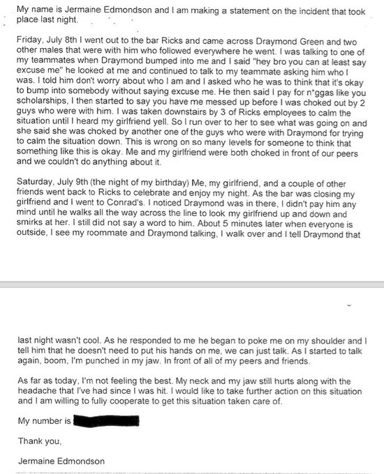 “Friday, July 8th I went out to the bar Ricks and came across Draymond Green and two other males that were with him who followed everywhere he went. I was talking to one of my teammates when Draymond bumped into me and I said ‘hey bro you can at least say excuse me’ he looked at me and continued to talk to my teammate asking him who I was. I told him don’t worry about who I am and I asked who he was to think that it’s okay to bump into somebody without saying excuse me. He then said I pay for n*ggas like you scholarships, I then started to say you have me messed up before I was choked out by 2 guys who were with him. I was taken downstairs by 3 of Ricks employees to calm the situation until I heard my girlfriend yell. So I run over to her to see what was going on and she said she was choked by another one of the guys who were with Draymond for trying to calm the situation down. This is wrong on so many levels for someone to think that something like this is okay. Me and my girlfriend were both choked in front of our peers and we couldn’t do anything about it.