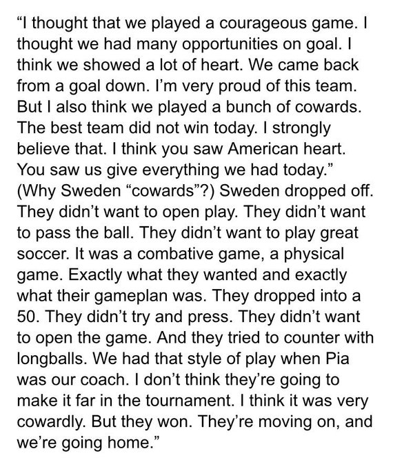 Full Hope Solo quote on Sweden after US was eliminated from the Olympics today. pic.twitter.com/UZVCAeur6m