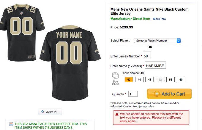 NFLShop now blocks fans wanting to get a HARAMBE nameplate on jerseys.