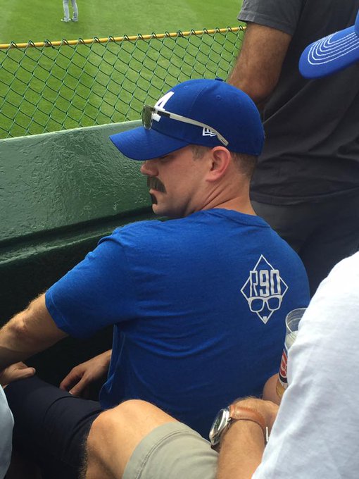Theo Epstein (and front office staff) is in the front row of the Wrigley bleachers in a fake mustache.#Cubs 2016. pic.twitter.com/AnZpHiAtWu