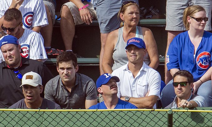 Here’s more of Epstein and the Cubs brass in the Wrigley bleachers on Friday afternoon as the Cubs played the Milwaukee Brewers, a game that will surely end with a celebration since the Cubs clinched the NL Central on Thursday night when the St. Louis Cardinals lost:
