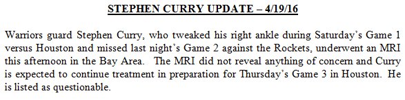A May 2 tip-off, presuming Curry is cleared to play by then, would afford the likely 2015-16 MVP some 15 days off in between his ankle sprain and the first game of the Conference semifinals. All the more motivation for Stephen’s Warrior teammates to end their series against the listless Rockets sooner rather than later so as not to risk the possibility that Curry's presence is needed in the first round.
