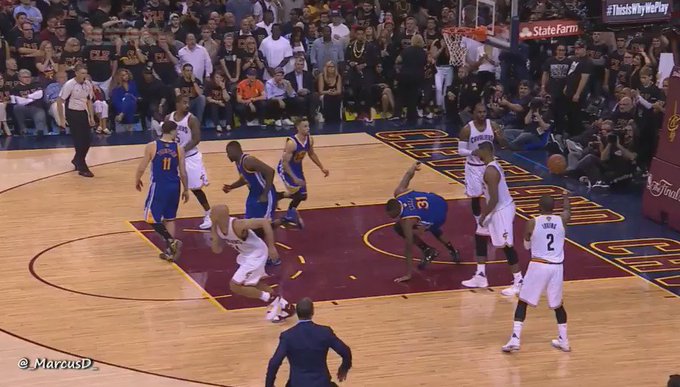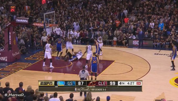 With just under 4 1/2 minutes left, Cavaliers center Tristan Thompson rebounded a missed free throw by Warriors guard Klay Thompson, and passed the ball off to LeBron James with the Cavaliers holding a 12-point lead. Curry, playing with five fouls, raced in to try to knock the ball loose; he did, but James leapt, regained possession, came down on Curry's back and went to the ground, resulting in a whistle and Curry's sixth personal foul, which would disqualify him from the game.